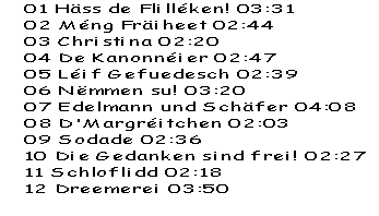 Das Luxemburger Ensemble Dullemajik stellt seine neue CD vor: Neben bekannten Weisen von Dicks und Lentz, wie de Kanonéier und d’Margréitchen, enthält die CD Lieder aus dem 18 Jahrhundert, aus der Zeit des 2. Weltkrieges sowie neue Kompositionen von Guy Schons und Sylvia Nels. Im Mittelpunkt stehen Lieder über Freiheit und Auswanderung. Es singen und musizieren: Guy Schons, voc, g / Sylvia Nels, voc, g / Nadine Bissen, voc, fl, cl / Maurizio Spiridigliozzi, acc / Lisa Berg, vc